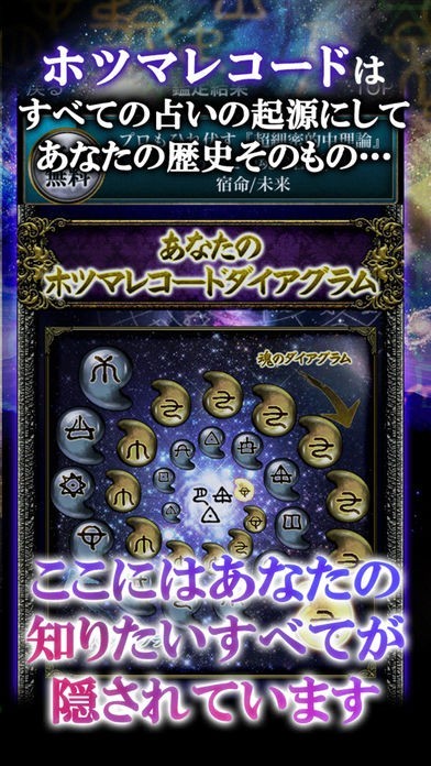 App Storeより引用ホツマレコードはすべての占いの起源にして、「あなたの歴史そのもの」です。感情/婚期/転機の全記録。精密なまでにあなたの人生全て、日付まで当てていきましょう。