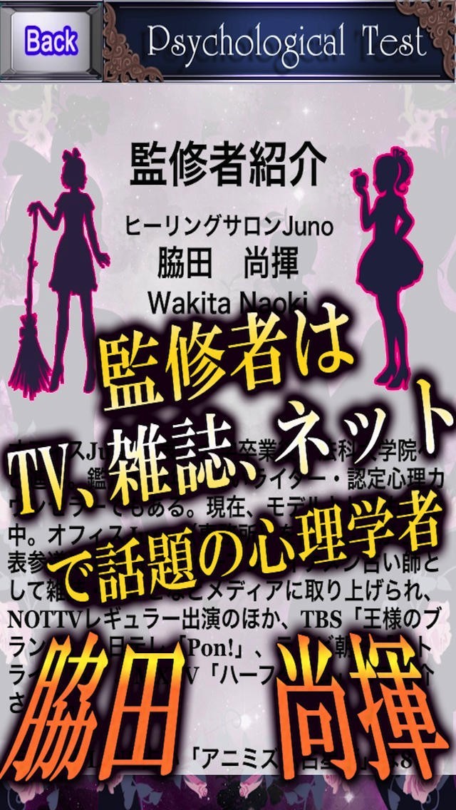 あなたの本当の性格、恋人に対する態度、恋人ができない理由など心の奥底に隠された欲望や隠された性格を徹底的に暴いていきます。また、人には聞けない夜の素顔も……ズバリ暴かれちゃいます。友達と、恋人と、ぜひお楽しみください!