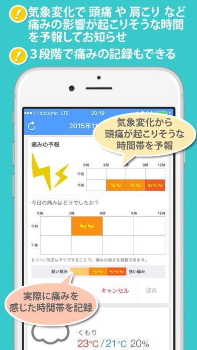 3. 天気予報をもとに、頭痛や肩こりなどの痛みが起こりやすい時間帯をマークでお知らせ