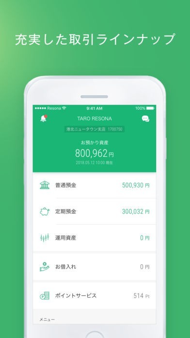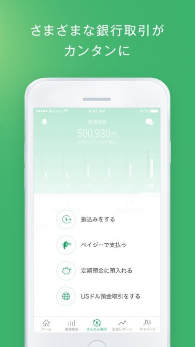 スマートフォンを使ってりそなグループの口座の残高照会や入出金明細などを確認することが出来るようになっているアプリで、振り込みやペイジー支払いなどにも対応しています。