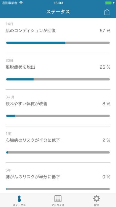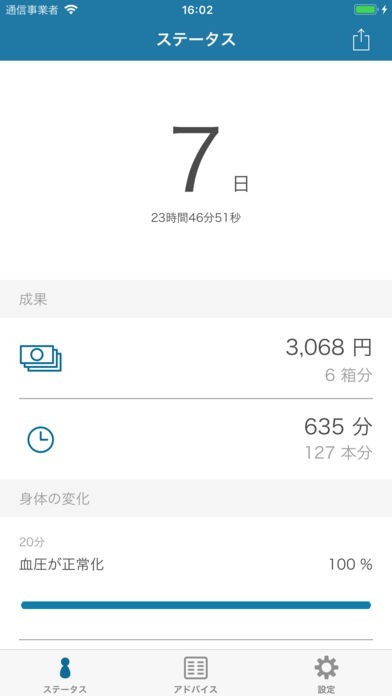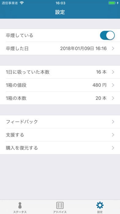 アドバイスを読み、卒煙の準備が整いましたら、1日に吸っていた本数や価格などを入力し、非喫煙者として、新たな人生を始める決意をします。その後、下記の機能が開放されます。タバコをやめたことで得られる成果を可視化しています。