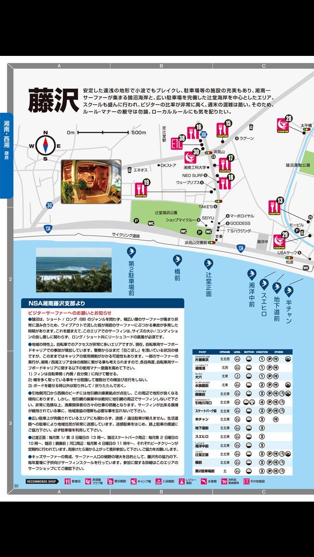 「サーフィンMAP BCM2013」は、特にサーフィン初心者のためのルールや基礎知識といった情報が数多く記載されています。 よって、サーフィンをしてみたいけれどなかなか勇気が出ないというような人が行動を起こすきっかけを与えてくれます。 また、それ以外の方も、サーフィンが盛んな場所の美味しいお店についての情報や宿や温泉などの情報も合わせて記載されている他、場所の地図などもしっかりと用意されているので、旅行プランを立てるガイドブック的な使い方をするのにも役に立ちます。