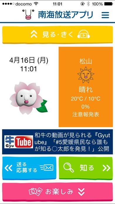 視聴者・リスナーのみなさんと南海放送との繋がりを「知る」「見る・きく」「応募する・送る」「遊ぶ」のカテゴリーにわけて、愛媛のニュースや天気、番組情報など掲載する一方、みなさんから動画やメッセージの投稿、プレゼント応募を簡単に行っていただけます。