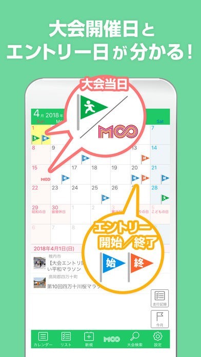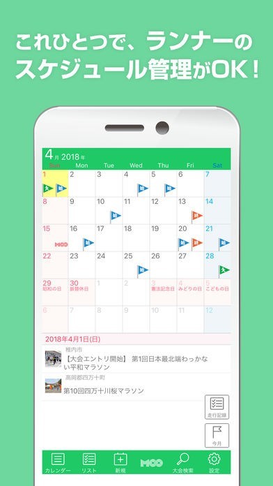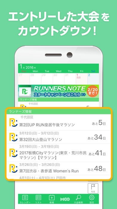 100種類ものマラソン大会のリマインダーが設定してあるので、カレンダーでいつでも有名なものの日程を確認することができます。さらに、参加する大会までの日数をお知らせしてくれます。