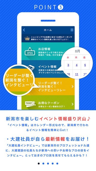 更に、店舗情報だけでなく、イベントカレンダーでは新潟市のイベント情報を網羅。「今日何しよう?」と思ったらカレンダーからイベントをチェック。