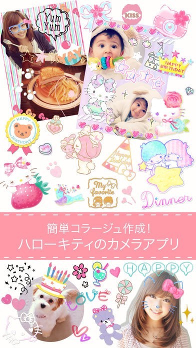 ハローキティコラージュはサンリオキャラクターで写真を彩ることのできるアプリで、テンプレートとコラージュしたり、ハローキティの形に写真を切り抜いたり、様々なスタンプで写真を彩って楽しむことができます。