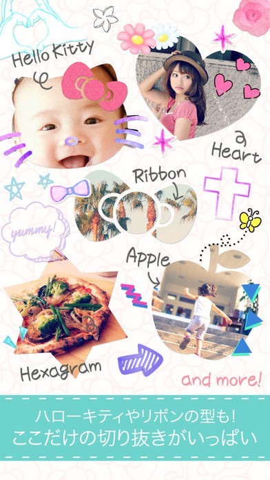 ハローキティの形や星型などに写真をトリミングできる