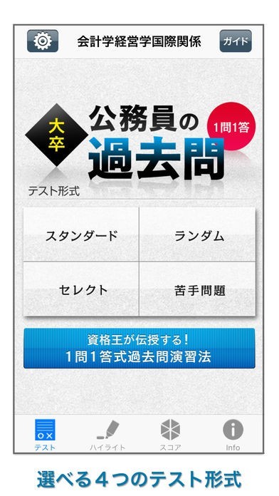 このアプリは、1問1答形式の過去問出題を、4つ切り口のテストで繰り返し学習できるように構成されています。
