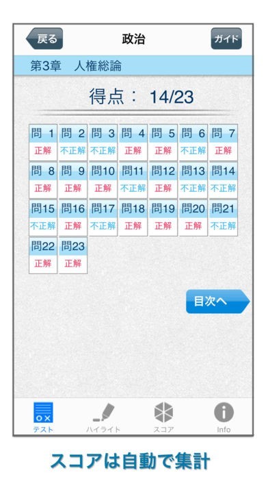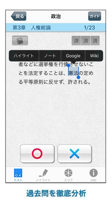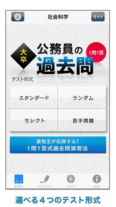 このアプリは、1問1答形式の過去問出題を、4つ切り口のテストで繰り返し学習できるように構成されています。