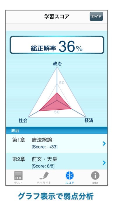 正解数や正解率などが、いつでも確認できます。テーマごとの正答率がグラフで表示され、苦手なテーマが一目でわかります。