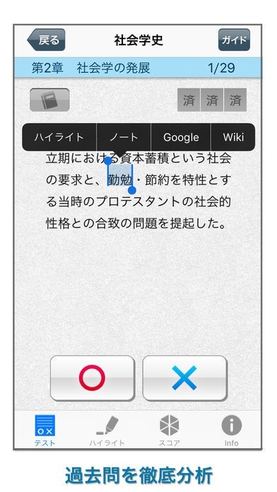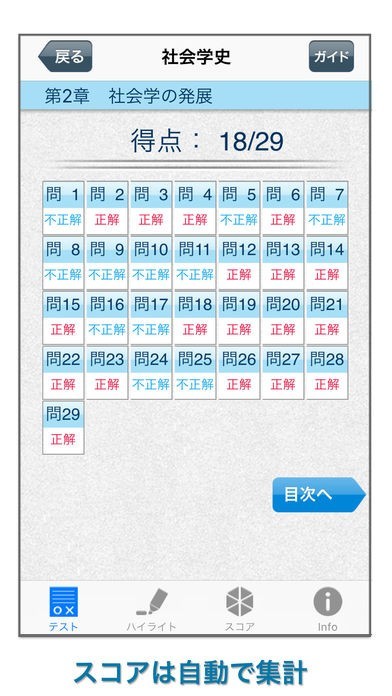 これがあれば、問題集を持ち歩かなくても電車での通学時間や休憩時間などの空き時間を有効利用して効率的に進められます。またテスト形式の結果、正解・不正解が一目でわかるので、試験までの残り時間に合わせた学習を行うことにも利用できます。