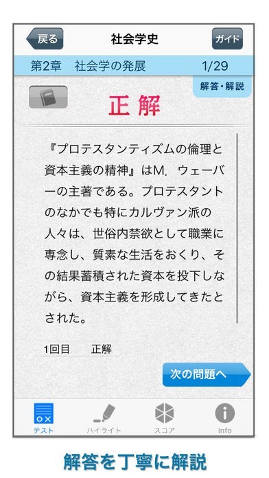 問題の解答には解説も同時表示されるので効率良い学習が可能