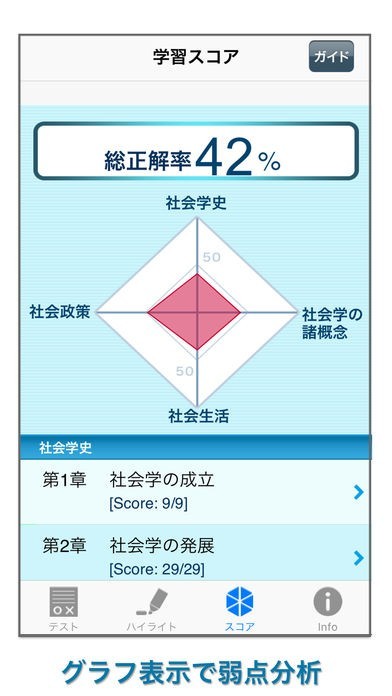 出題が一問一答形式で全問題の解答に丁寧な解説が付いているので、自分で問題を理解しながら知識習得が可能です。また、4つのテーマごとの正答率がグラフで表示されるので、苦手なテーマが一目でわかるので苦手問題の克服には最適です。