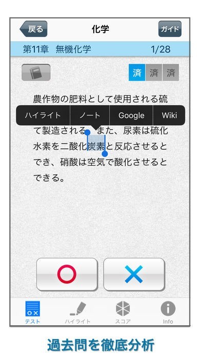 このアプリがあれば、問題集を持ち歩かなくても電車での通学時間や休憩時間などの空き時間を有効利用して効率的に進められます。またテスト形式の結果、正解数や正解率が一目でわかるので、試験までの残り時間に合わせた学習を行うことにも利用できます。