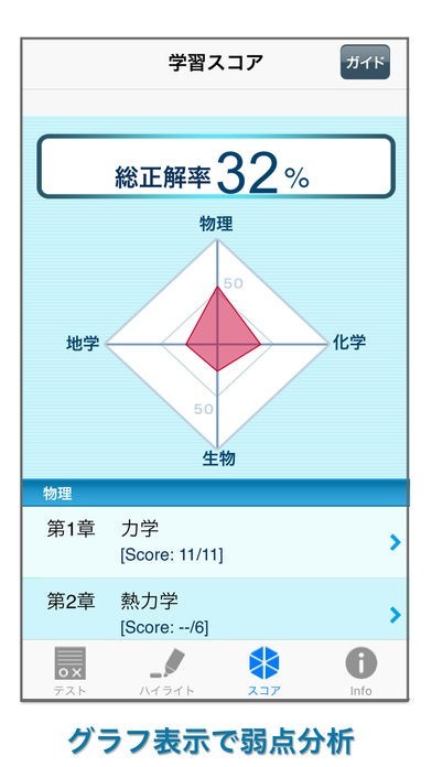 出題が一問一答形式で全問題の解答に丁寧な解説が付いているので、自分で問題を理解しながら知識習得が可能です。また、4つのテーマごとの正答率がグラフで表示され、苦手なテーマが一目でわかるので苦手問題の克服には最適です。