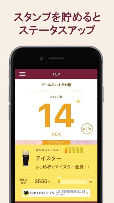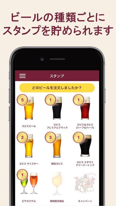 エビス(ヱビス)ビール専門ビアバー「YEBISU BAR」公式アプリで、店舗利用者を対象としたコンテンツが用意されています。来店時にエビスビールを飲むとスタンプが取得でき、さらに会員ステータスをアップさせることが可能です。特徴は仮想の中で楽しむのみのアプリとは異なる点で、特典やイベント情報といった実用性も備えています。また、全国ランクで上位を目指す、なんて楽しみ方も実現します。