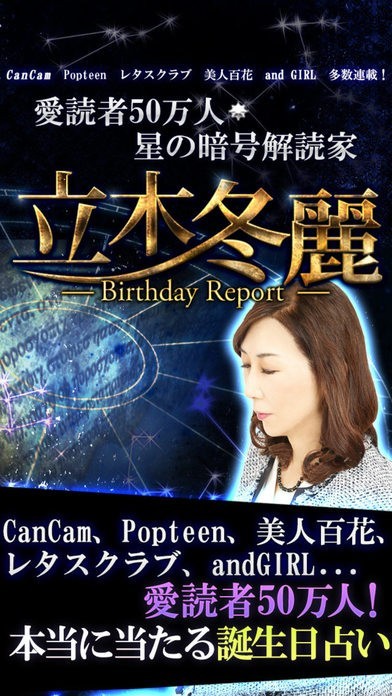 CanCam Popteen 美人百花 レタスクラブ andGIRL……数々の女性誌で多数連載!星の暗号家/メッセンジャーとして活躍する占い師「立木冬麗」の誕生日占い「バースデイレポート」をお楽しみ下さい。バースデイレポートは、星の暗号解読家/星のメッセンジャーとして活躍する「立木冬麗」が西洋占星術を基に独自の占法で導き出す、あなただけの特別な鑑定書です。あなたが生まれた時にどんな星が頭上にあったのか、そこにはどんな意味があるのか。