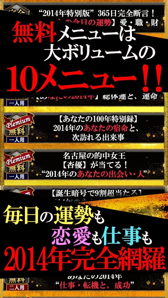 このアプリを使うことによって、9人の占い師たちを集めて信ぴょう性の高い占いを見ることができます。 とくに、「毎日の運勢」を見ることができて、星による評価で、「総合運」、「仕事運」、「恋愛運」、「金運」を把握できるので、瞬間的に今日はどうなのかを把握することができます。 さらには、月単位や年単位でグラフによって、上がり下がりをチェックできるので、それをもとに、仕事の計画を立てたり、旅行の予定を変更したりといったことに使えるので実用的です。 さいごに有料で、「人間関係に与える影響と、恋人との関係」などを把握できるのでどうしても知りたい場合はお金を支払いましょう。