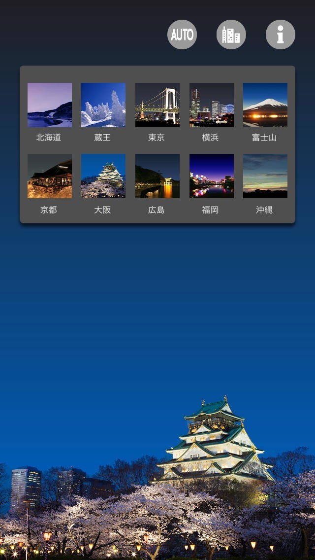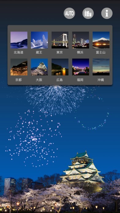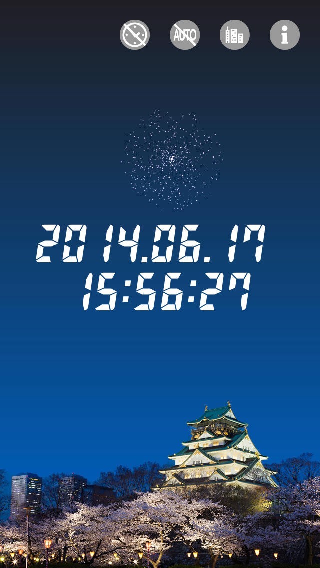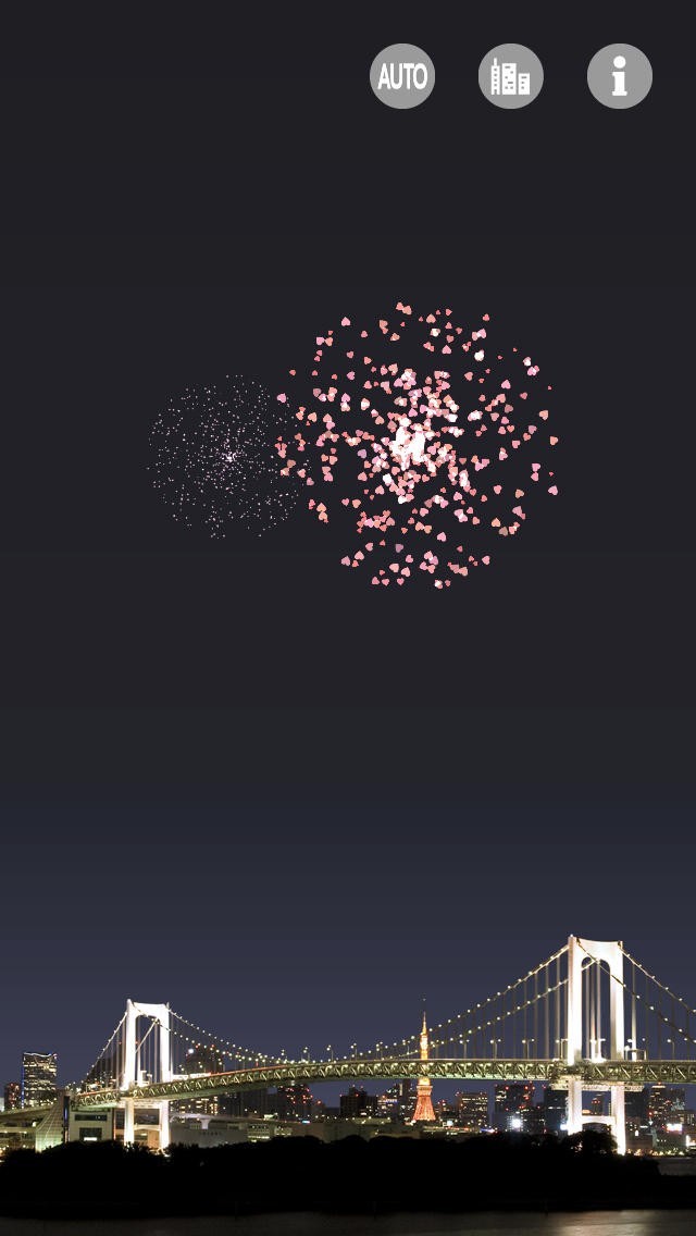 画面に表示された夜景をタップすると、夜空に花火を打ち上げることができるアプリです。タップする位置やスピードによって打ち上がる花火がランダムに変化します。花火は色や形が異なる様々な種類が用意されています。夜景は東京や京都、富士山など実際の景色から選ぶことができます。 AUTOを選べば操作しなくても花火は自動で打ち上がっていきます。日にちと時間を表示することもできるので、夜景と花火を背景にした時計としても使うことができます。