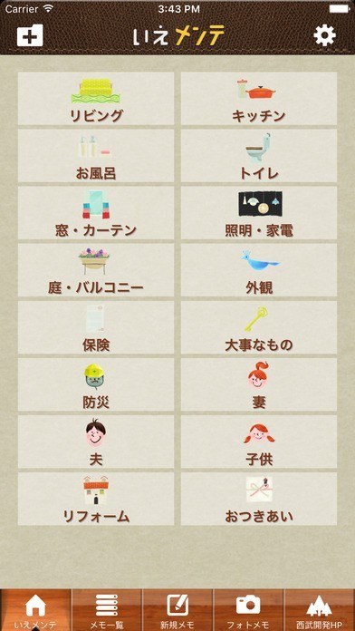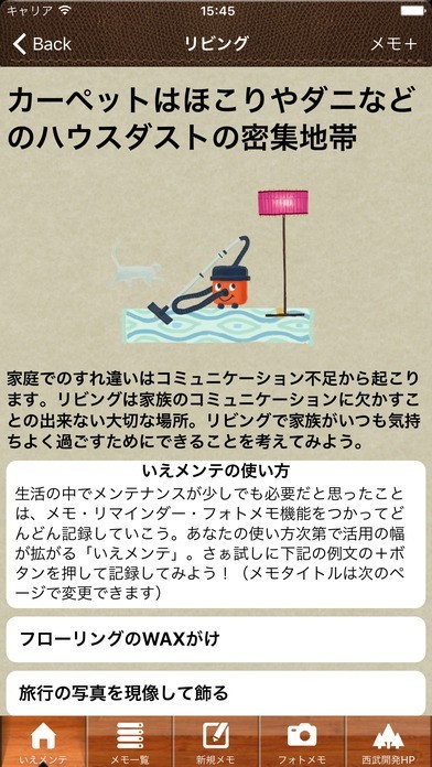自宅のメンテナンスにお役立ちな便利アプリ「いえメンテ」 メンテナンス登録機能を搭載しており、リビング、キッチン、お風呂などのカテゴリーに分けて、掃除などのメンテナンスを行った日を登録することができます。 リマインダー機能を利用すれば、メンテナンス実行日に通知でお知らせが可能。 忘れてしまいがちな細かな箇所も、リマインダー登録しておくことでしっかり管理することができるでしょう。 さらにフォト機能も用意。メンテナンス前後の写真を登録できるのも嬉しいポイントとなっています。