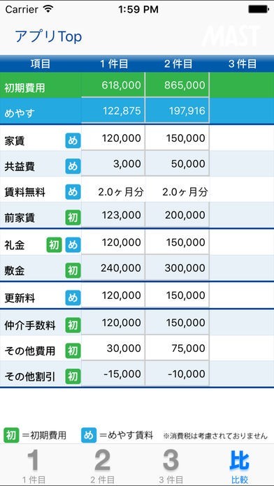 簡単な入力で、賃貸にかかるお金の比較が最大3つまでできます。