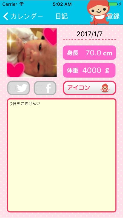 2 カレンダー・メモ機能(体重・身長の記録、画像付き日記の登録)