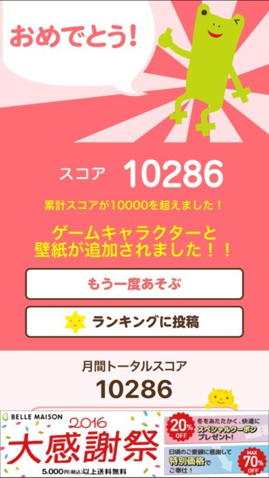 ランキング機能では、ランキングボタンからランキングを投稿し上位に入れるように何度も挑戦できる