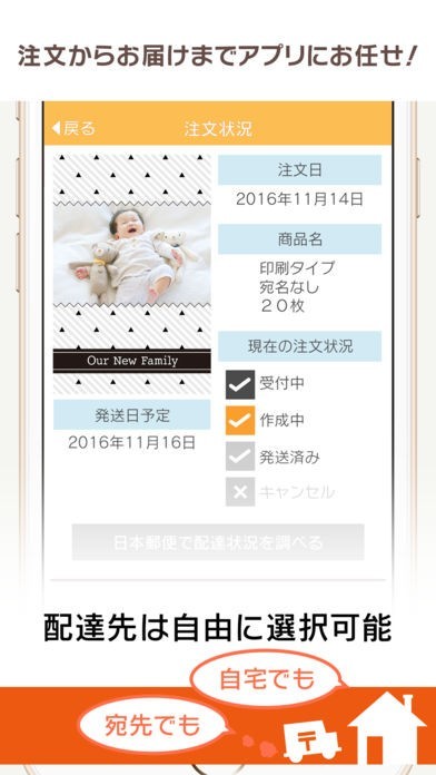 手間のかかるユーザー登録をしなくても注文できるので、アプリをダウンロードしたらだれでもすぐに挨拶状を注文できます。