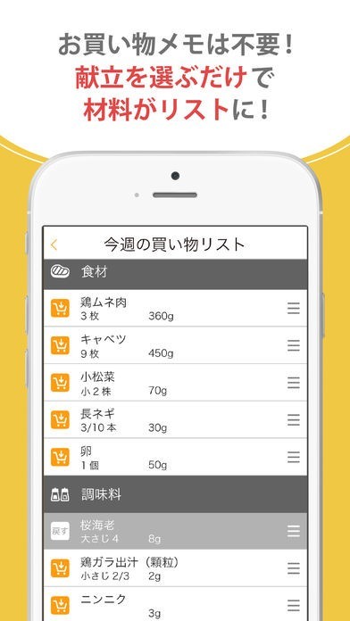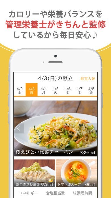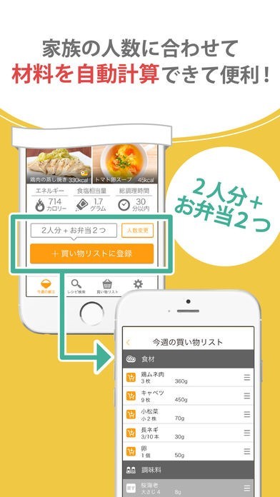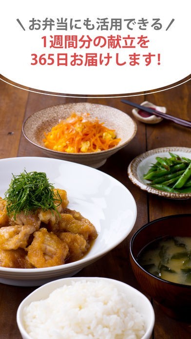 忙しい毎日でも家族の為に、自分の為に、美味しくて栄養バランスのとれた食事を用意したい!そんな方にオススメのレシピ提案アプリです。お弁当にも使える料理も豊富で、管理栄養士がカロリーや栄養バランスを監修した献立レシピが1週間分365日届くので、毎日の献立作り・お弁当作りに役立つアプリです。作りたい献立と人数を選択すると、必要な材料や分量が自動計算されそのまま買い物リストに登録する事が出来ます。買い物リストが人数分を自動計算してくれるので、あとはスーパーなどでお買いものをしてレシピ通りに作るだけです。またお弁当マークがついているレシピでは、「お弁当にも利用する」機能を利用すると、お弁当の個数分だけ買い物リストに材料が自動追加されるので自分で計算せずに買い物を済ませる事ができます。美容・食育・アスリートなどの「目的別」や、和・洋・中などの「料理ジャンル別」、そして「食材別」と、目的や用途に応じて条件に合ったレシピを探せるので毎日の献立作りに役立つこと間違いなしです!材料や作り方の手順は、わかりやすく写真付きで説明されているので、料理が少し苦手な方でも安心して作る事ができます。