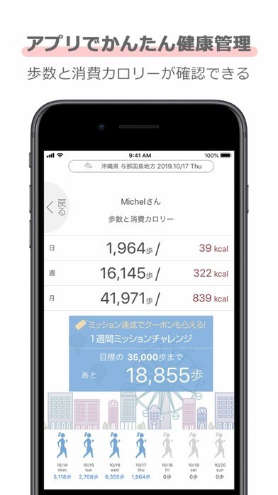 また、iPhoneの歩数計の機能を使って自動で歩数・消費カロリーを計測し、あなたの健康管理をサポートします。