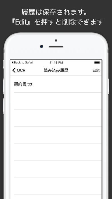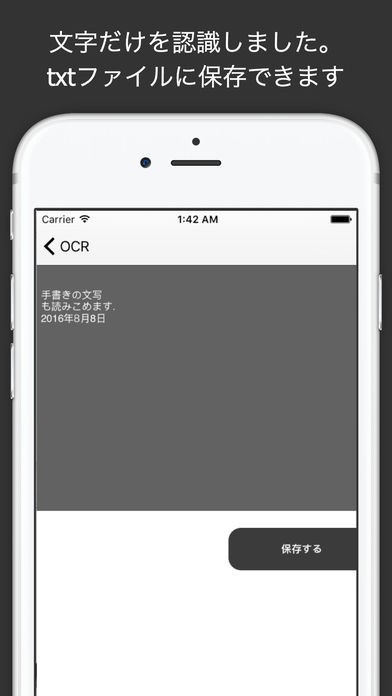 とにかくシンプルで余計な機能や装飾は出来る限りカットしているので使いやすいアプリとなっています。 できることといえば、スマートフォンのカメラを使って文字を読み取ることですが、書類などPCで書かれたきれいな文字だけではなく、一人ずつ特徴があって読み取るのが困難な手書きの文字にもしっかりとたいおうしてくれるという質の高さが素晴らしいです。 また、読み取ったものはテキストファイルに保存することができ、PCに送るなどいろいろと使えますし、重要な情報な場合は履歴からすぐに削除することも可能です。