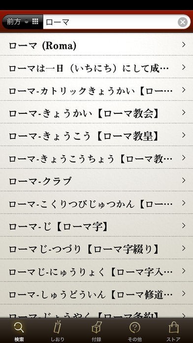 このアプリの検索は、完全一致検索の他、前方・部分・後方にも対応しています。また、厳密な検索の他に「曖昧検索」を行うことができ、例えば「バ『ド』ミントン」という項目を「バ『ト』ミントン」の検索でも表示することができます。