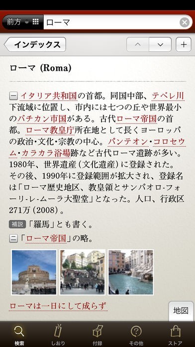地名項目での地図表示や、アプリからのジャンプが可能な項目へのURL掲載、1万2000点超のカラー画像の収録、NHK世界遺産ビデオの閲覧など、紙媒体の辞典では難しいコンテンツが数多く載録されています。