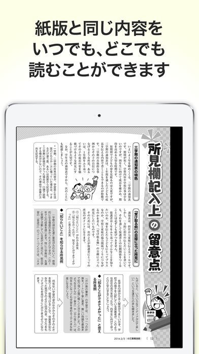 アプリ内で購読ライセンスを購入したら、その期間中に自動ダウンロードをオンにすれば更新されます。特別付録はつきませんが、書店に足を運ぶことなく中身のある教育誌をいつでも見ることができます。