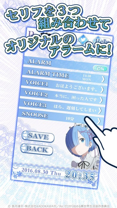 リゼロアラームは、かわいい女の子レムの画像と声の目覚まし時計で、アラーム用のボイスがあります。レムが好きな人は、90種類以上ある中から3つまで好みのボイスを選んでセットします。