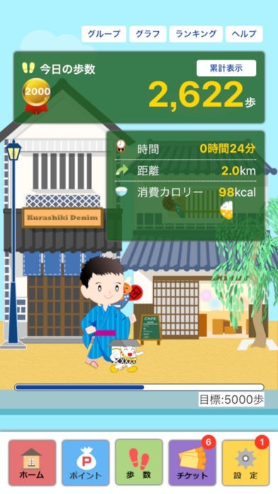 チャレンジイベントや歩いた距離によりアプリ内の地図上を旅するバーチャルウォーキング、友だちとチームを作って競い合うグループランキングなど、楽しく歩くための機能が満載!ポイントと連動して手に入るチケットを使って自分のキャラクターをカスタマイズしましょう!
