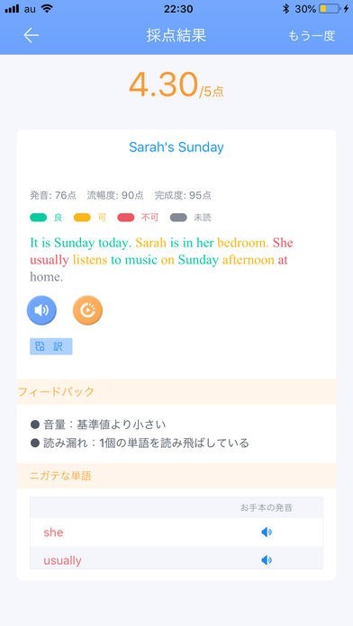 話した英文をAIが分析して、きちんと発音できていたかが単語ごとに4段階で評価されます。単語の色が良い順に青、黄、赤、灰で表示されるので、一目で発音の良さを確認できます。