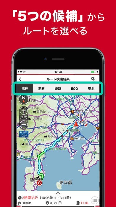 今いるところからの渋滞回避ルート、どれくらいで到着地につくのかなどを瞬時にルート検索かけて5個候補出してくれるのが使い勝手良い