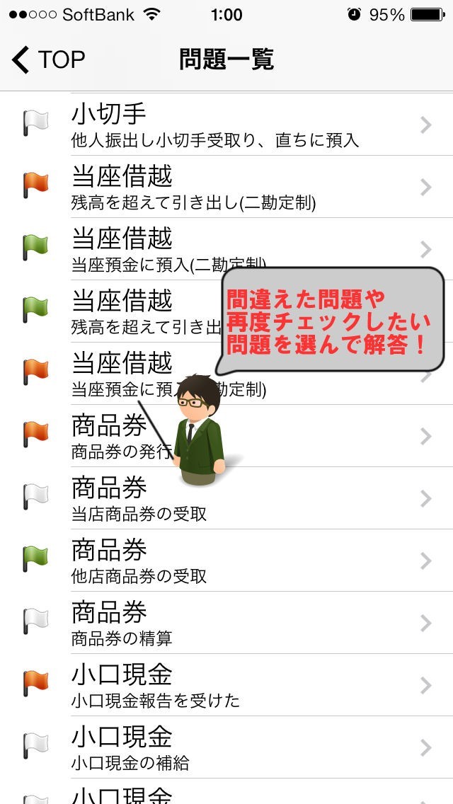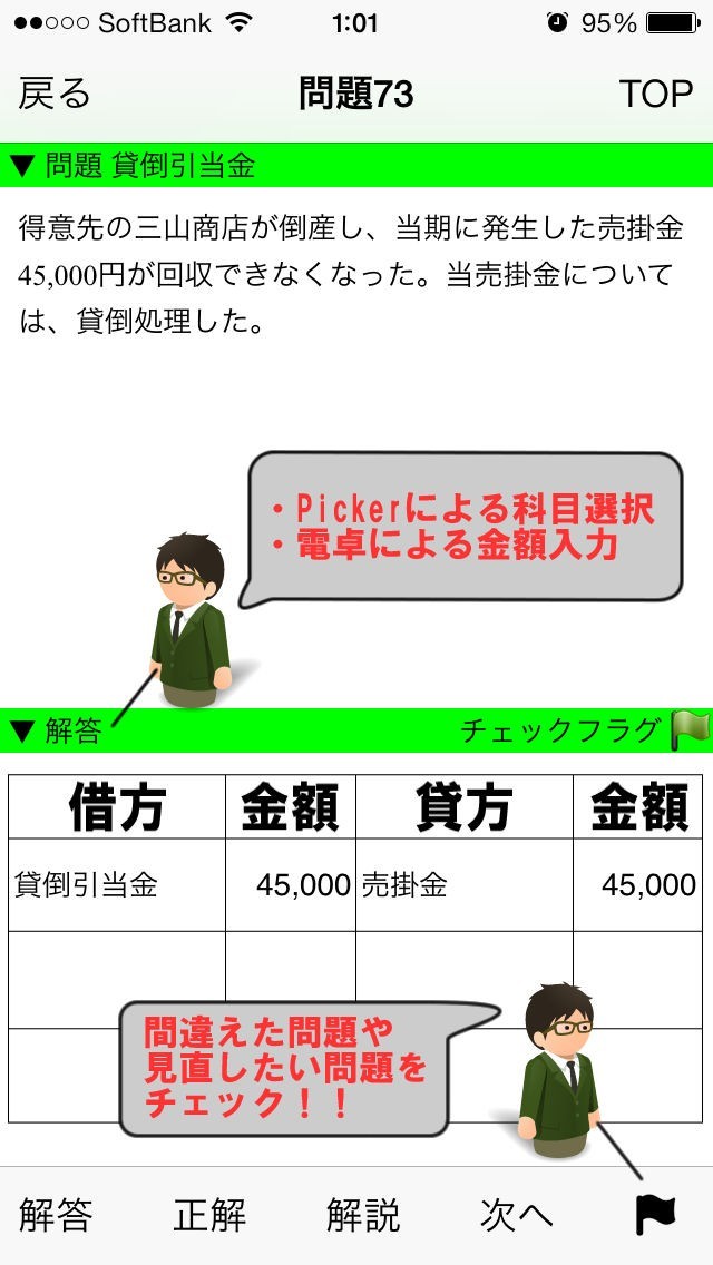 仕訳の解説が充実しているので、理解を深めながら学ぶことができます。チェックフラグを付けていれば、その一覧から選んで解くなど、くりかえし復習しやすくできているので、忘れにくくなりますね。