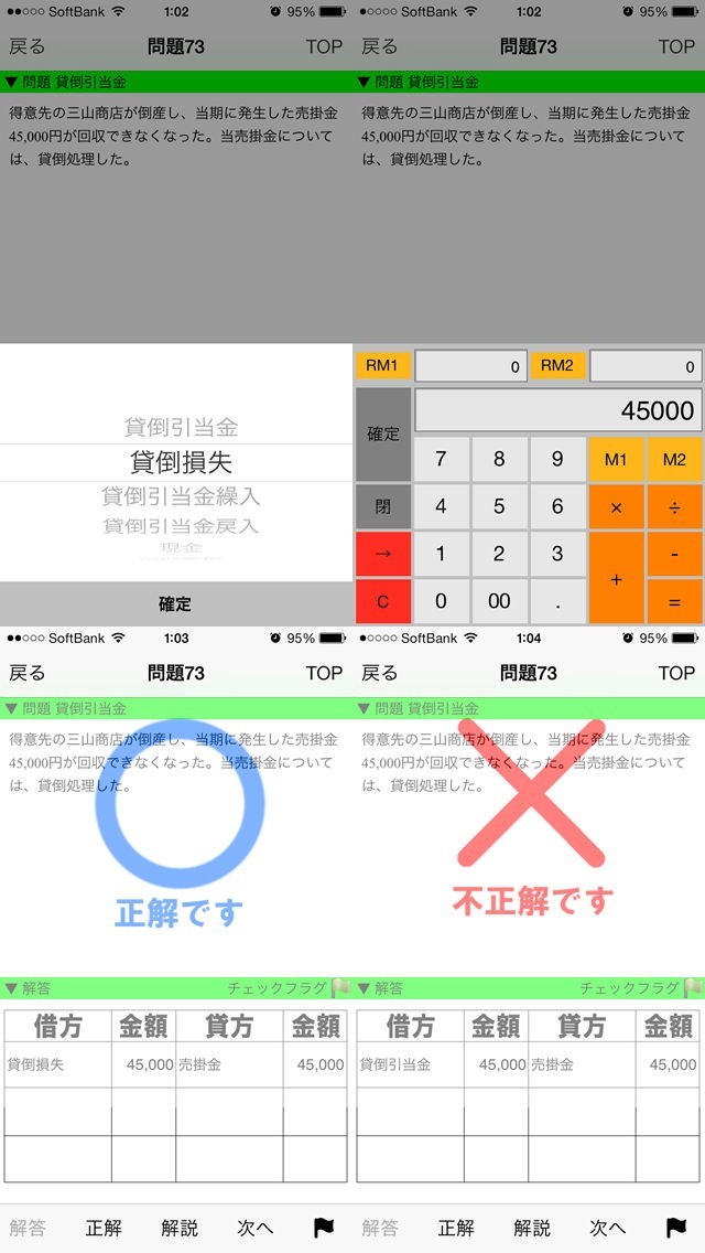 実際の試験の解答と同じように電卓を使って計算することができるので、試験の本番にそなえられます。勘定科目を選択し回答も可能なので、さらに計算力がつけられます。本番に近い計算方法で合格を目指しましょう。