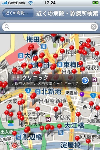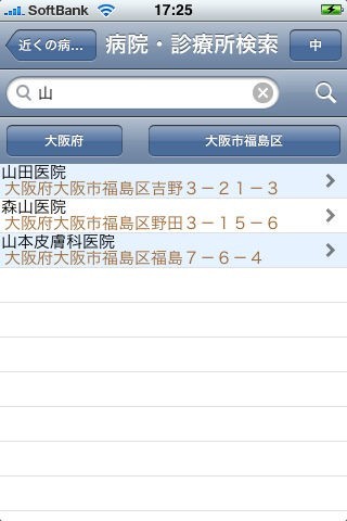 ダウンロード直後は現在位置周辺約2kmの病院のみ病院情報が閲覧可能です。