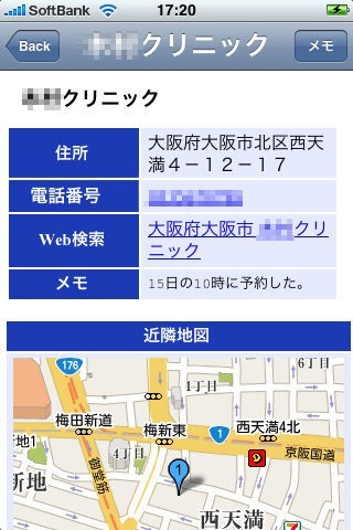 掲載項目は、名称、住所、電話番号、地図、さらにWeb検索で診療項目や診療時間を調べることも可能です。アップグレード版では、スクロール先や検索先でも情報を表示します。