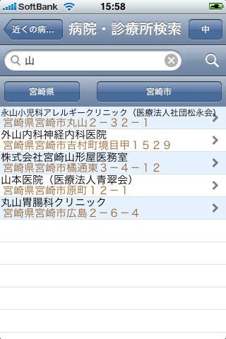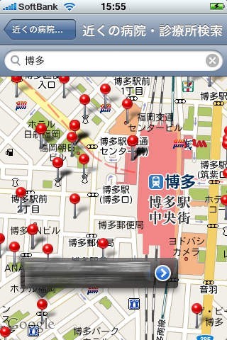 ダウンロード直後は現在位置周辺約2kmの病院のみ病院情報が閲覧可能です。