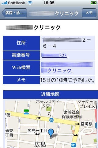 掲載項目は、名称、住所、電話番号、地図、さらにWeb検索で診療項目や診療時間を調べることも可能です。アップグレード版では、スクロール先や検索先でも情報を表示します。