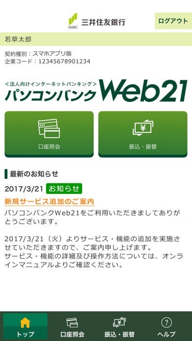 App Storeより引用三井住友銀行が提供する法人向けインターネットバンキングの「Web21スマホアプリ」です。パソコンバンクWeb21(以下「Web21」)のパソコンで提供している一部機能(※)を、スマートフォンアプリで簡単・便利にご利用いただけます。