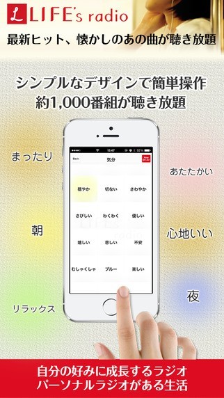 その日の気分やテンションに合わせた音楽を流してくれるラジオ番組をiPhoneで聞くことが出来るラジオアプリが「LIFE’s radio」です。まったりやリラックスなどその時に気分やテンションに合ったカテゴリーボタンをタップすることで、約1000番組の中から雰囲気に合った音楽を流してくれるラジオ番組をオンエアーしてくれるアプリとなっていて、利用すればするほどアプリがユーザーの好みを学習して、より自分の好みに近いラジオステーションを作ってくれます。気に入ったラジオ番組はお気に入りに登録しておくことですぐに視聴を開始することができるようになります。
