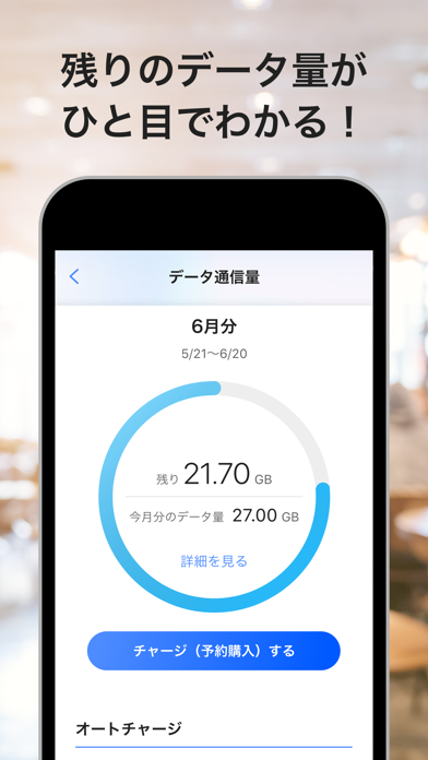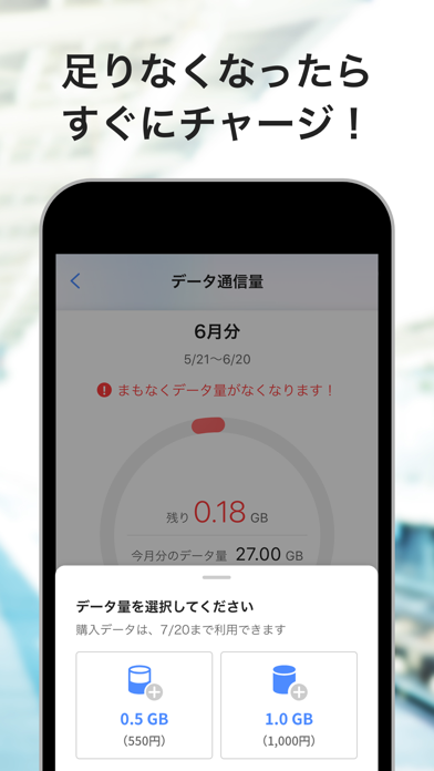 データと色でデータの使用状況をお知らせします。データ量が少なくなったらチャージの予約・購入もかんたんに出来ます。