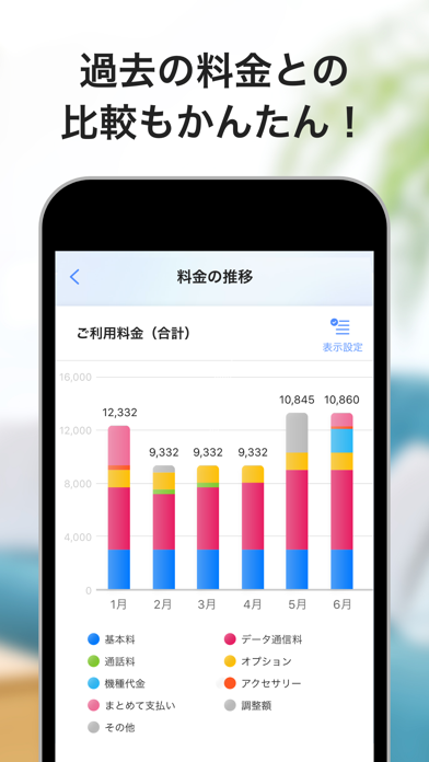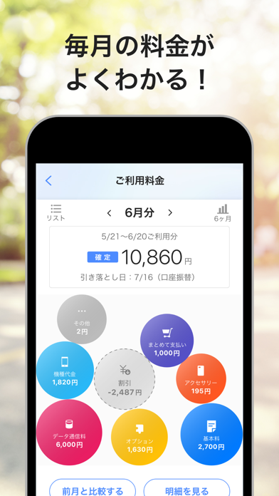 料金推移の確認や前の月との比較が、1タップでかんたんに出来ます。また気になる項目はタップで詳細をチェックできます。