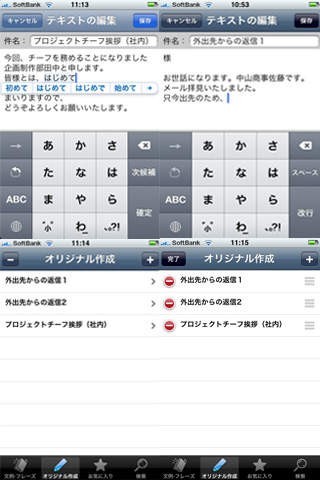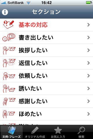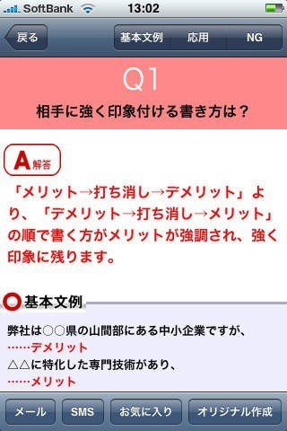 文例だけでなく、“端的な表現で相手に受け入れられやすく、気遣いを感じさせるメール”のパターンや考え方も掲載し、同時にNGフレーズも紹介しています。読むだけでもあなたのメール力が確実にUPする、メリット満載のアプリです。アレンジ文例や、オリジナルもどんどん登録して、あなただけの充実した文例アプリとして、是非ご活用ください。