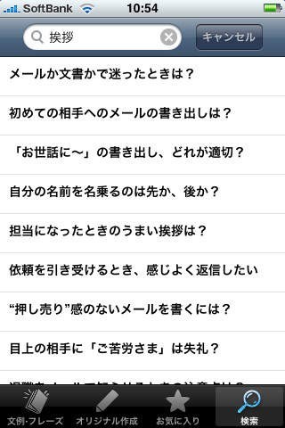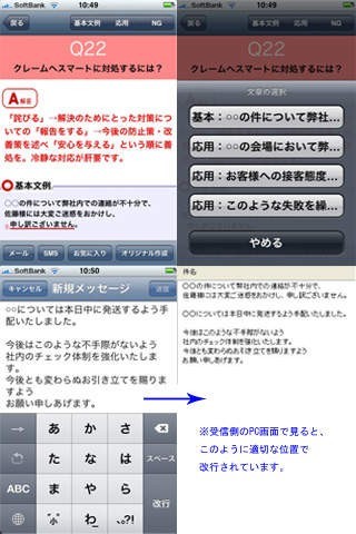 アプリ中で紹介する文例・フレーズをメール等に転用する場合、文章として適切な位置で改行しておりますが、送信者および受信者の端末の画面サイズないしはその設定によって違和感のある位置で折り返されることもあります。ご了承の上、ご自身で適宜調整下さい。